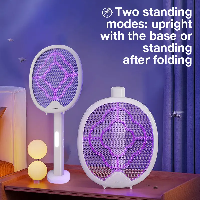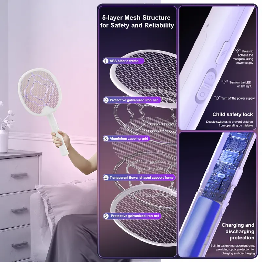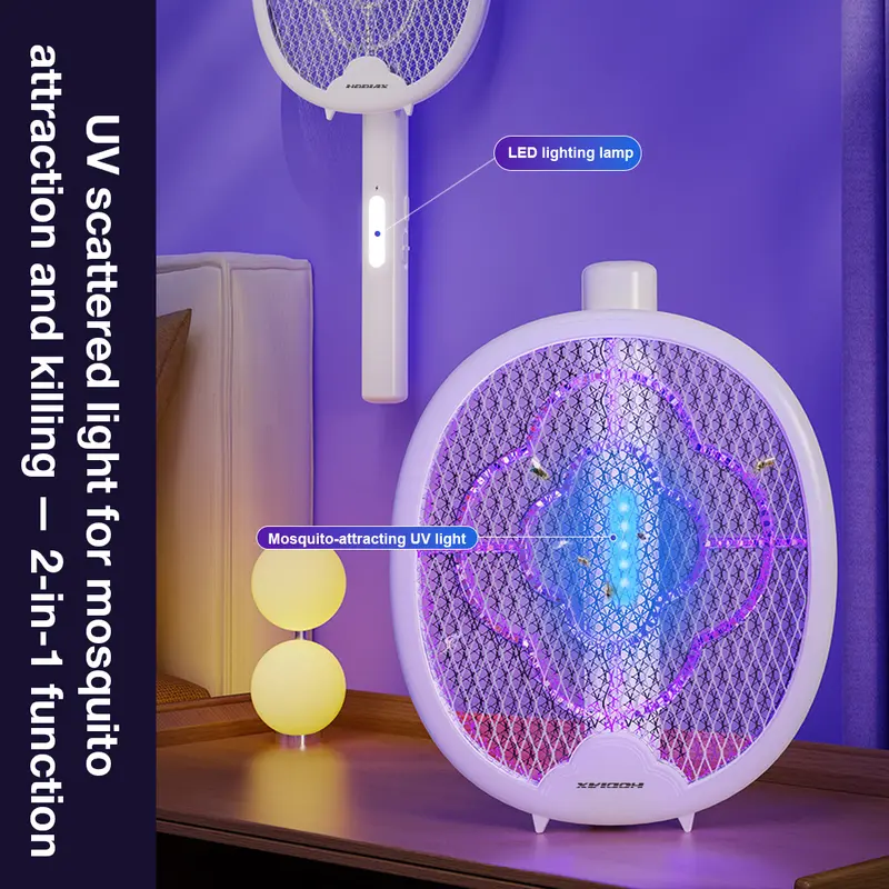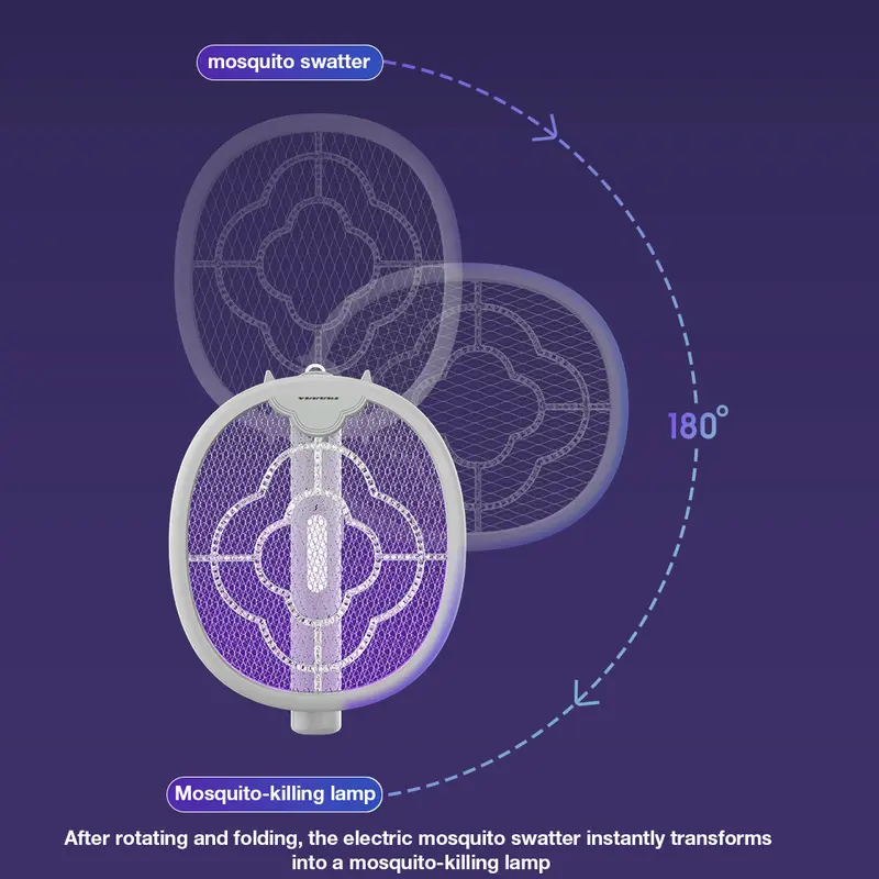 When folded and the UV light is turned on, light passes through the transparent ring-shaped plastic strip in the middle layer, creating UV scattered light that effectively attracts mosquitoes to the electric grid for elimination.