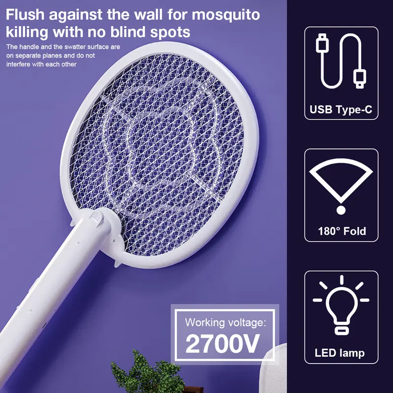 Foldable Electric Mosquito Fly Swatter 2700V Rechargeable Handheld Bug Zapper Racket Insect Killer with 3-layer Mesh Type-C Charging Cable for Indoor Outdoor Pest control